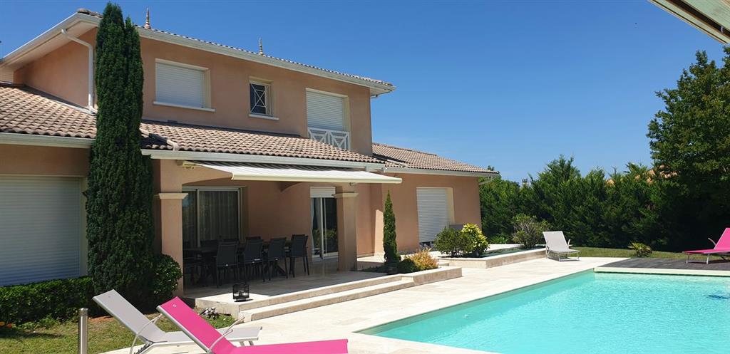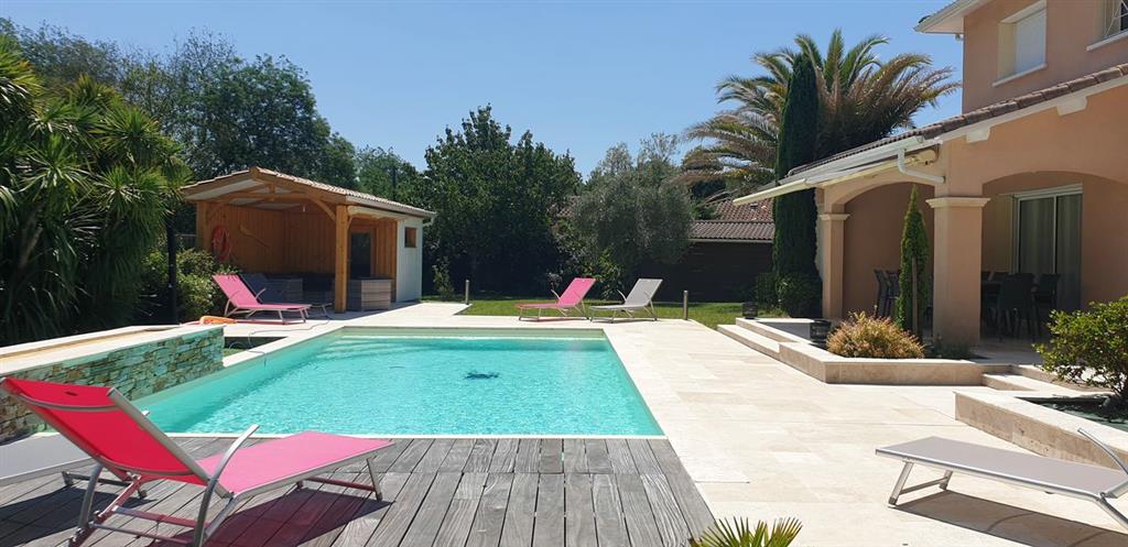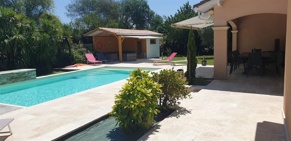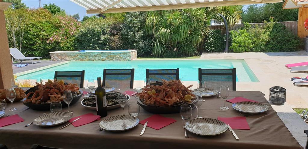 Sie werden einen 9×4,5 m großen beheizten Pool mit Rollladen, eine 130 m² große Terrasse mit Gartenmöbeln, Liegestühlen, eine Terrasse mit einem großen Außentisch, einen Holzkohlegrill, 10 Fahrräder für Erwachsene, eine Tischtennisplatte und eine Boulefläche entdecken Gericht.