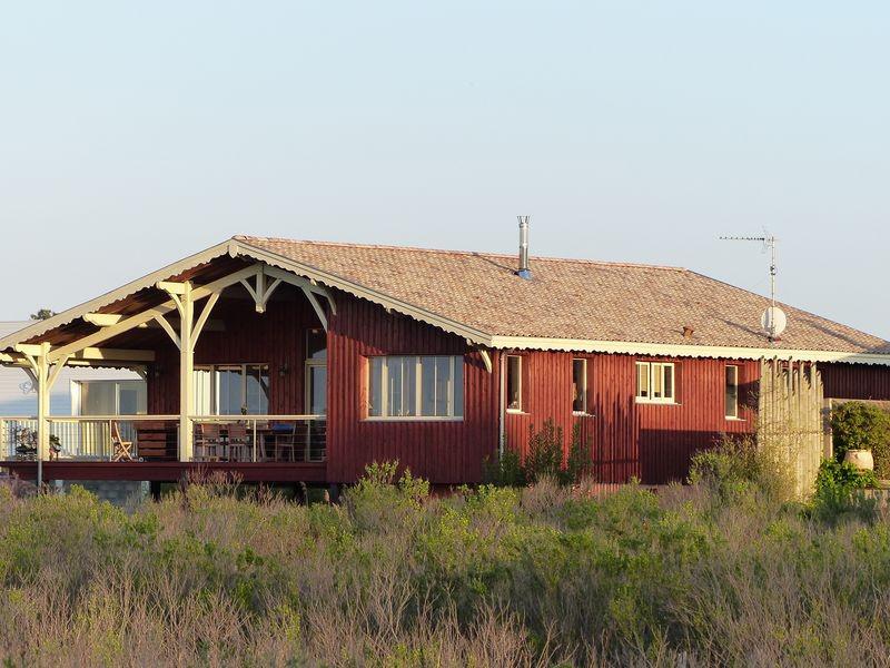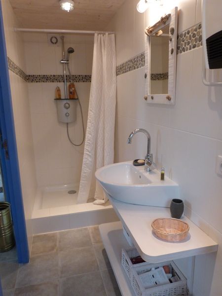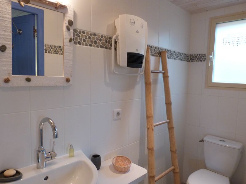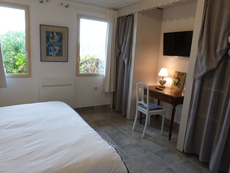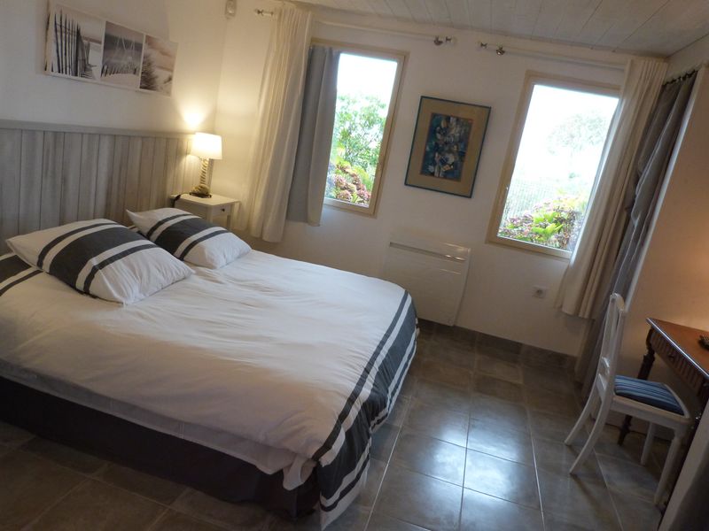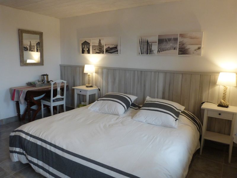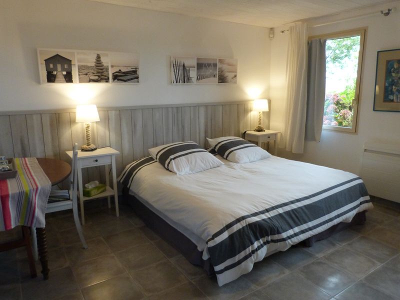Maison réalisée en éco-construction. Grand lit double, douche, lavabo, WC, rangements, bureau, boissons chaudes offertes. Petit déjeuner (bio) proposé en salle à manger ou en terrasse face au Bassin.
