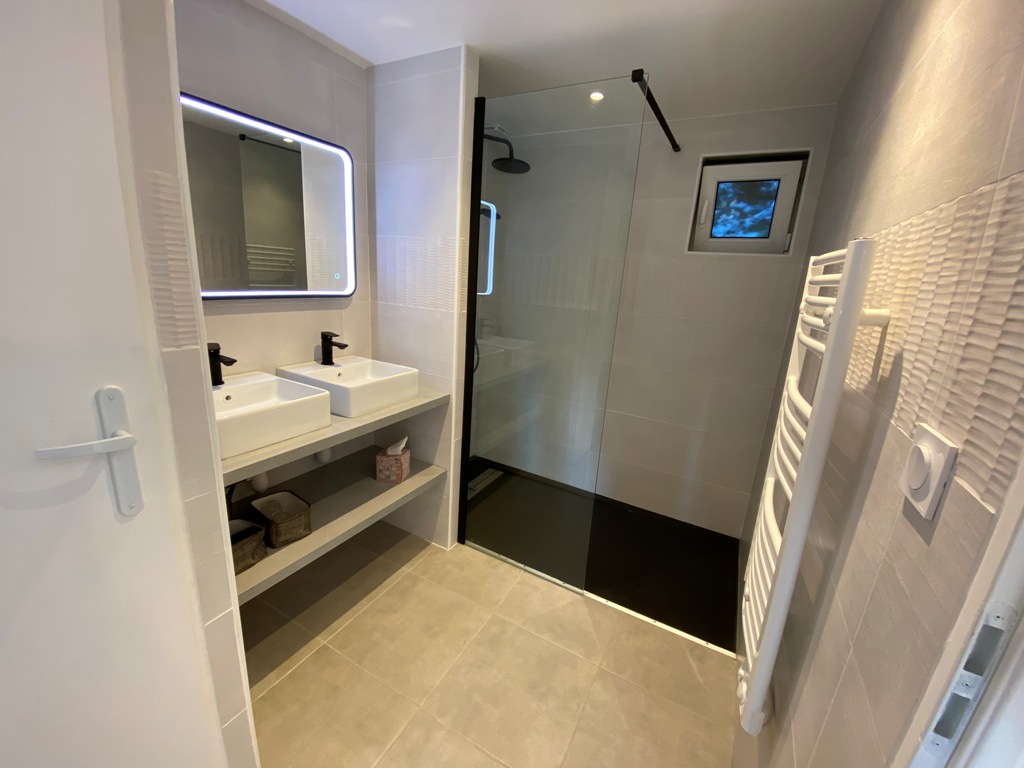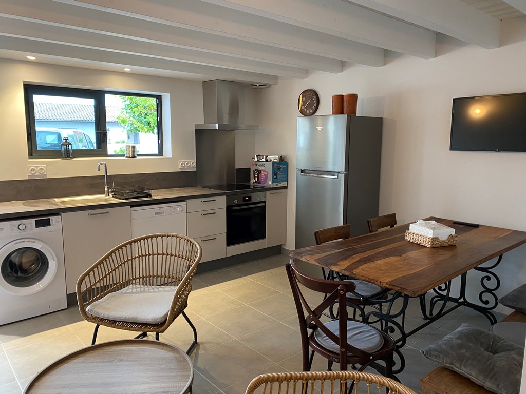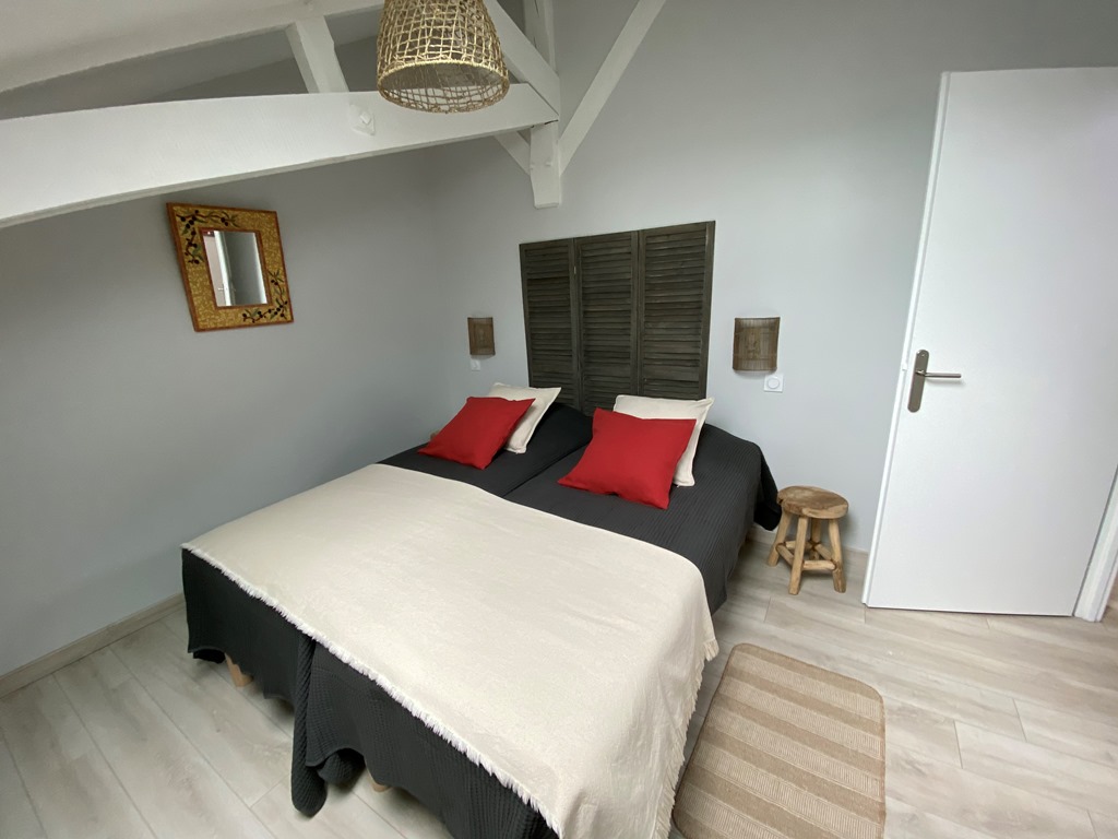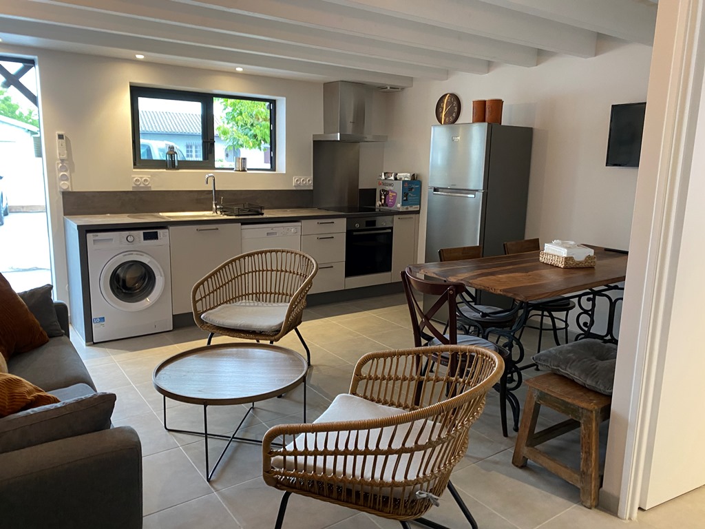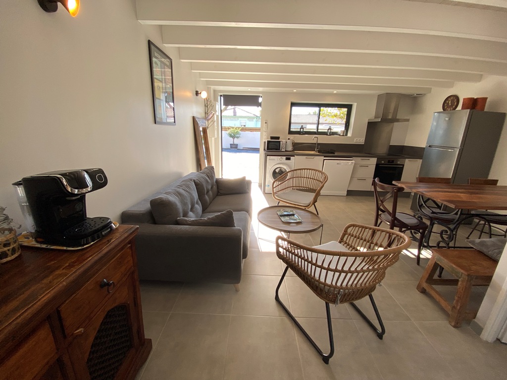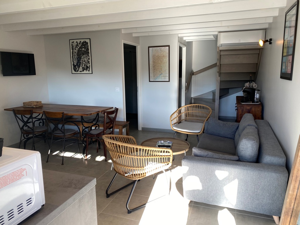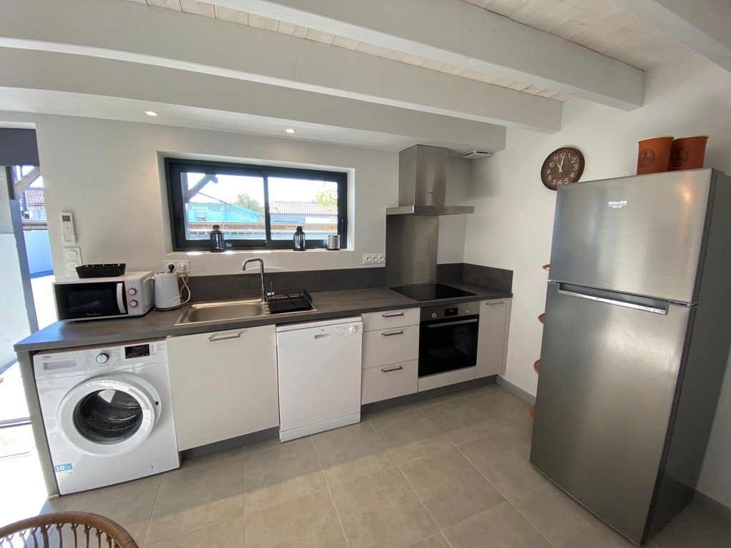 Appartement neuf de 60m² entièrement équipé et de tout confort : Climatisation réversible, lave-linge, lave-vaisselle, terrasse abritée, wifi … ainsi qu’une place de parking privée gratuite. 2 chambres à l’étage. 2 wc. Animaux admis avec un supplément de 5€/jour.