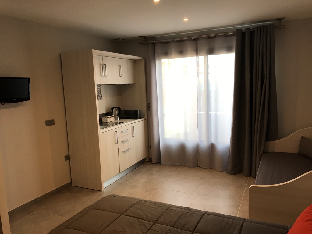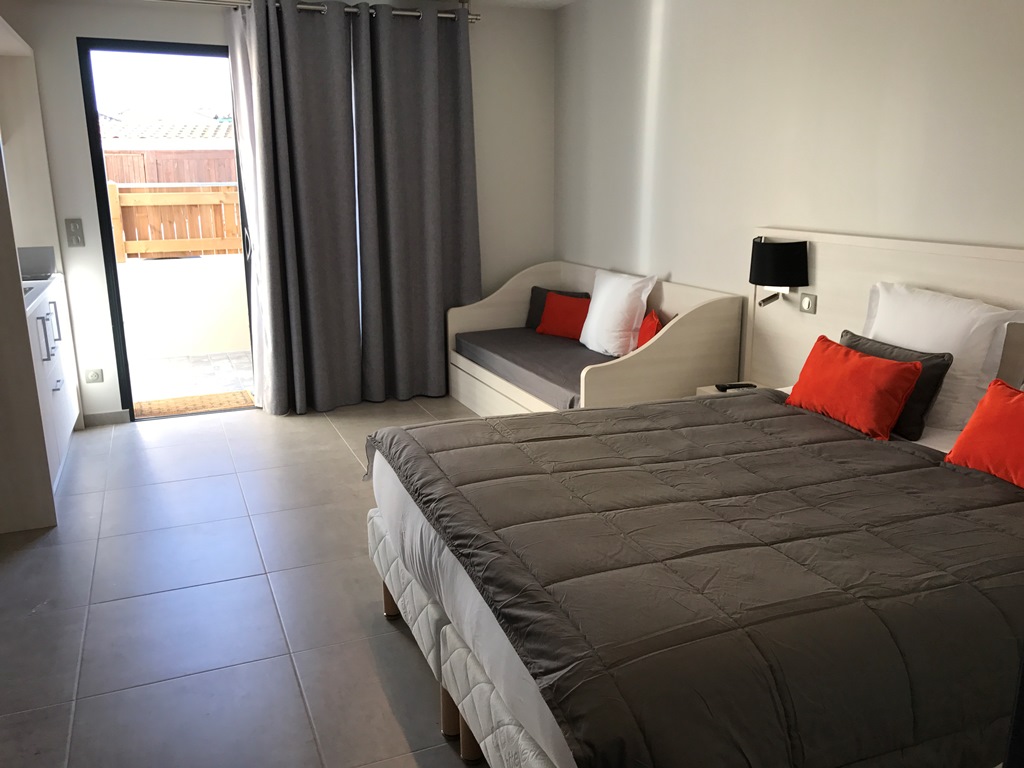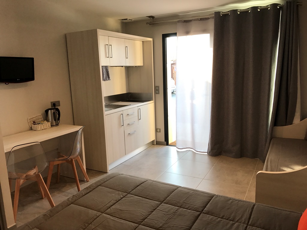 Nous proposons 3 studios entièrement rénovés, pouvant accueillir de 2 à 4 personnes. Chaque studio est équipé d’une kitchenette, d’une télévision, d’un lit double modulable et d’un canapé convertible. La salle d’eau comprend une douche à l’italienne spacieuse, un porte-serviettes chauffant, et des WC séparés. Une petite terrasse privative complète chaque logement.