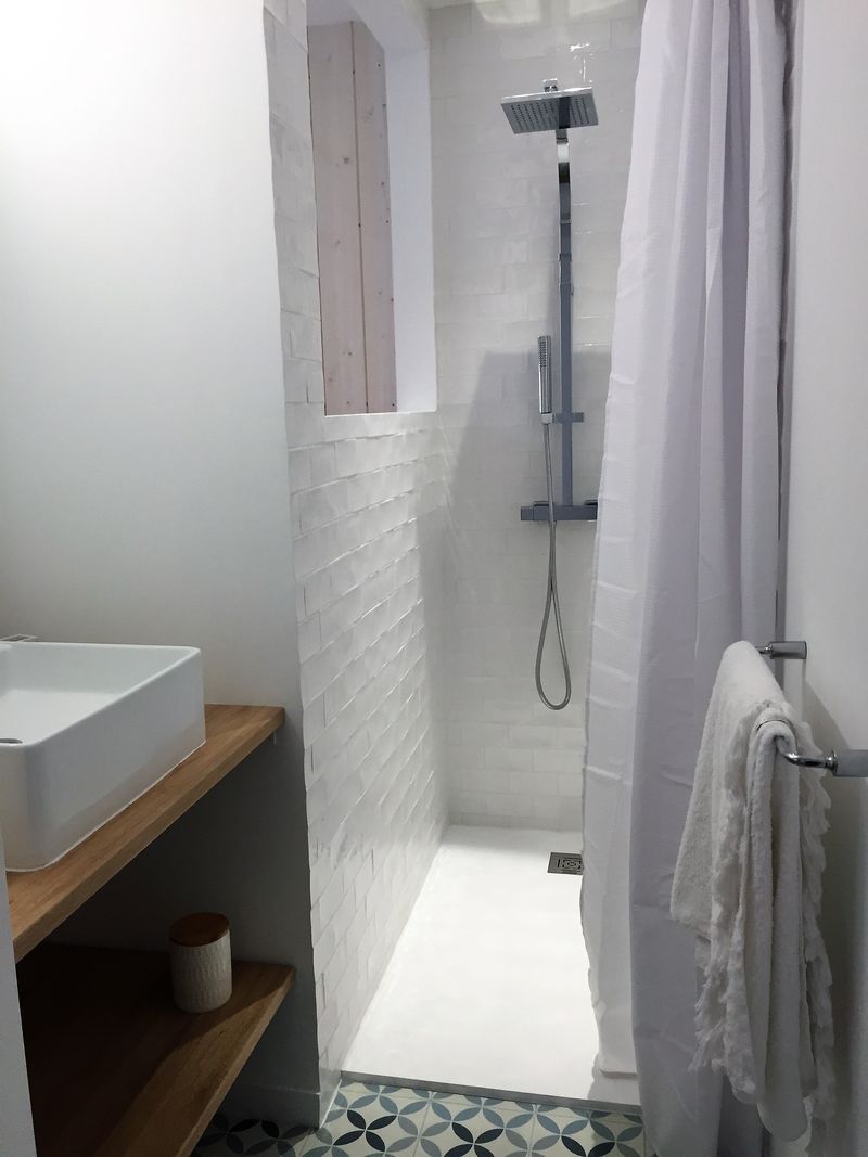 Sur votre droite, des wc privatifs, puis la salle d’eau originale avec sa douche à l’italienne, son plan-vasque où vous trouverez serviettes et produits de toilette, sèche-cheveux.