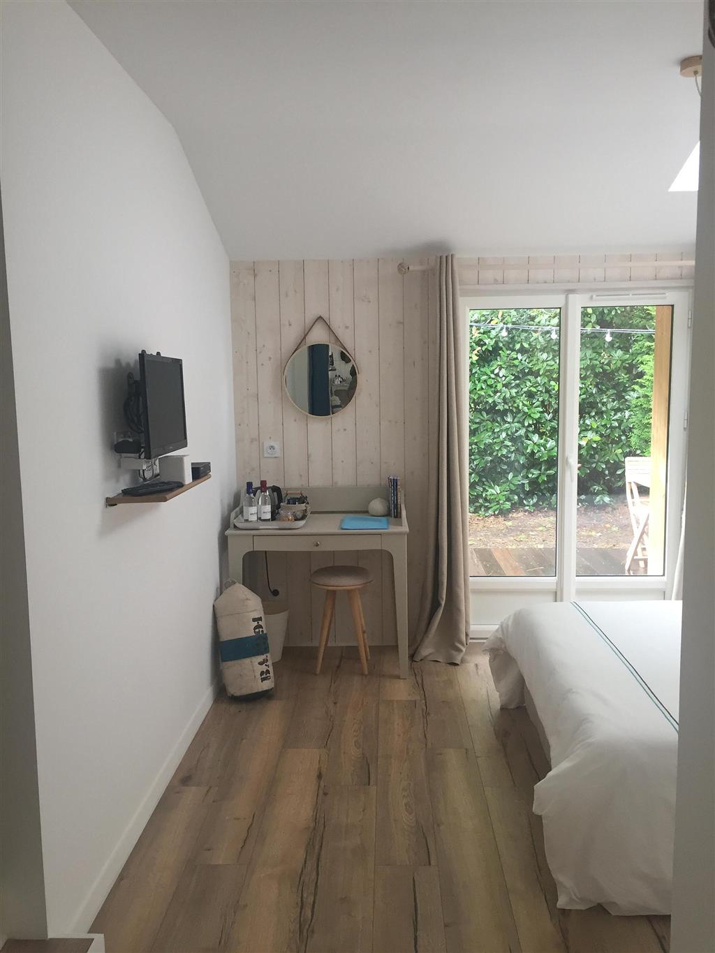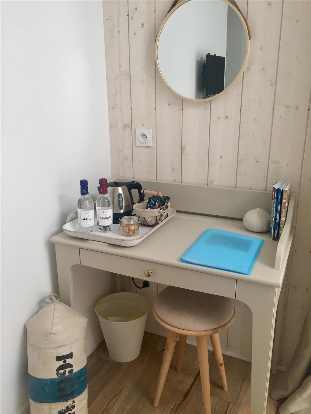 L’espace nuit est composé d’un lit double 140×200 avec linge de lit en gaze de coton et matelas à mémoire de forme, des chevets Starck, un dressing, un bureau avec bouilloire pour prendre café, thé, tisane.