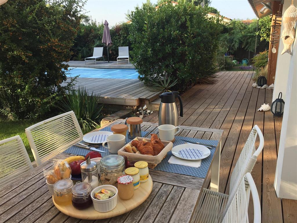 Le petit-déjeuner continental copieux est servi en terrasse ou dans notre pièce à vivre, les jours de pluie.