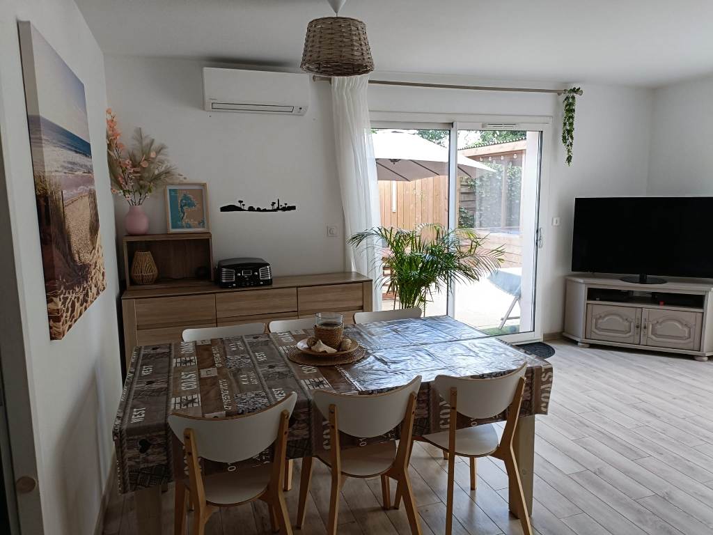 Maison 108m² de plain-pied idéalement située sur 420 m² de terrain clos et 3 places de parking. Composée de 3 chambres avec TV dont 1 chambre avec salle d’eau. Cuisine entièrement équipée, coin bar et ouverte sur le salon. Salon et salle à manger avec TV, climatisation. Salle de bain (double vasque) avec wc. 2ème wc indépendant. Spa sous terrasse couverte avec salon de jardin et douche extérieure. Barbecue au charbon. Table de ping-pong. Parc clôturé pour enfants en bas âge avec cabane, toboggan, porteurs, vélos bébés. A disposition : jeux de société, jouets et matériel de puériculture. Commerces, centre-ville, marché, port ostréicole, pistes cyclables … à proximité.