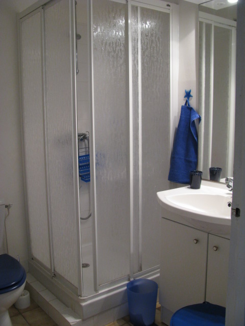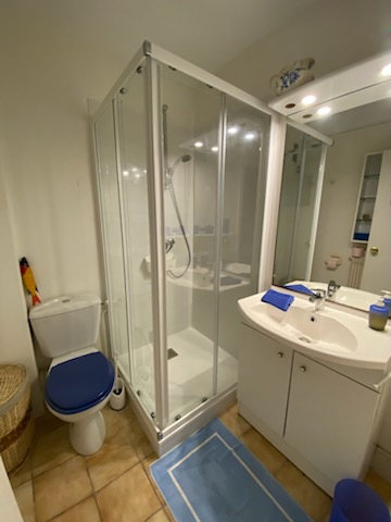 SB indépendante avec cabine de douche-meuble vasque et WC – couloir avec penderie