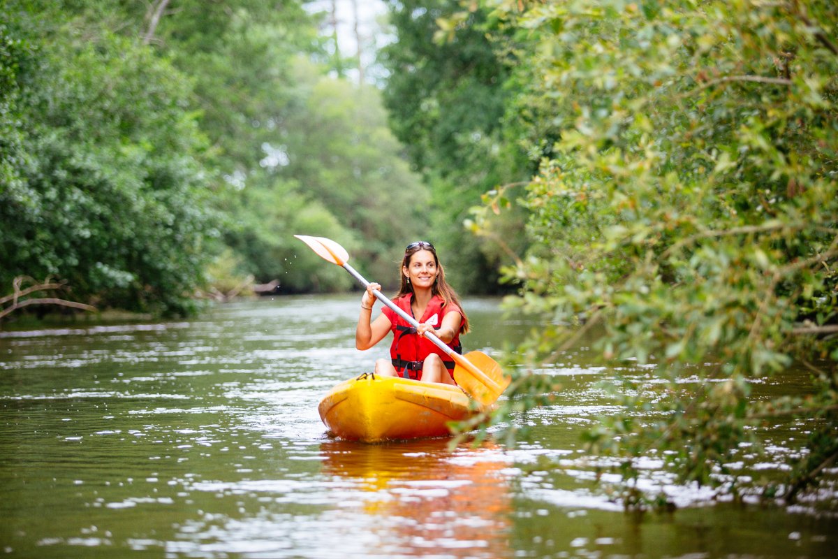 Après un footing en pleine forêt, cap sur le port de Biganos. Deux heures de canoë sur La Leyre vous attendent ! Une fois équipés, vos embarcations filent dans un incroyable corridor de verdure.